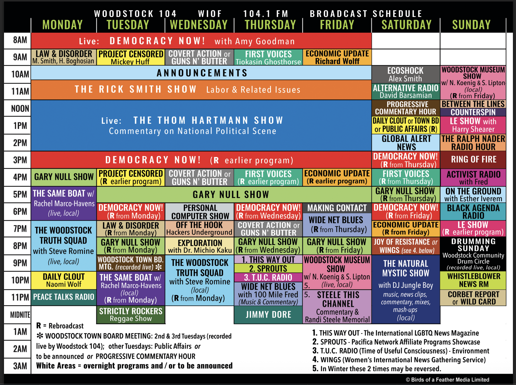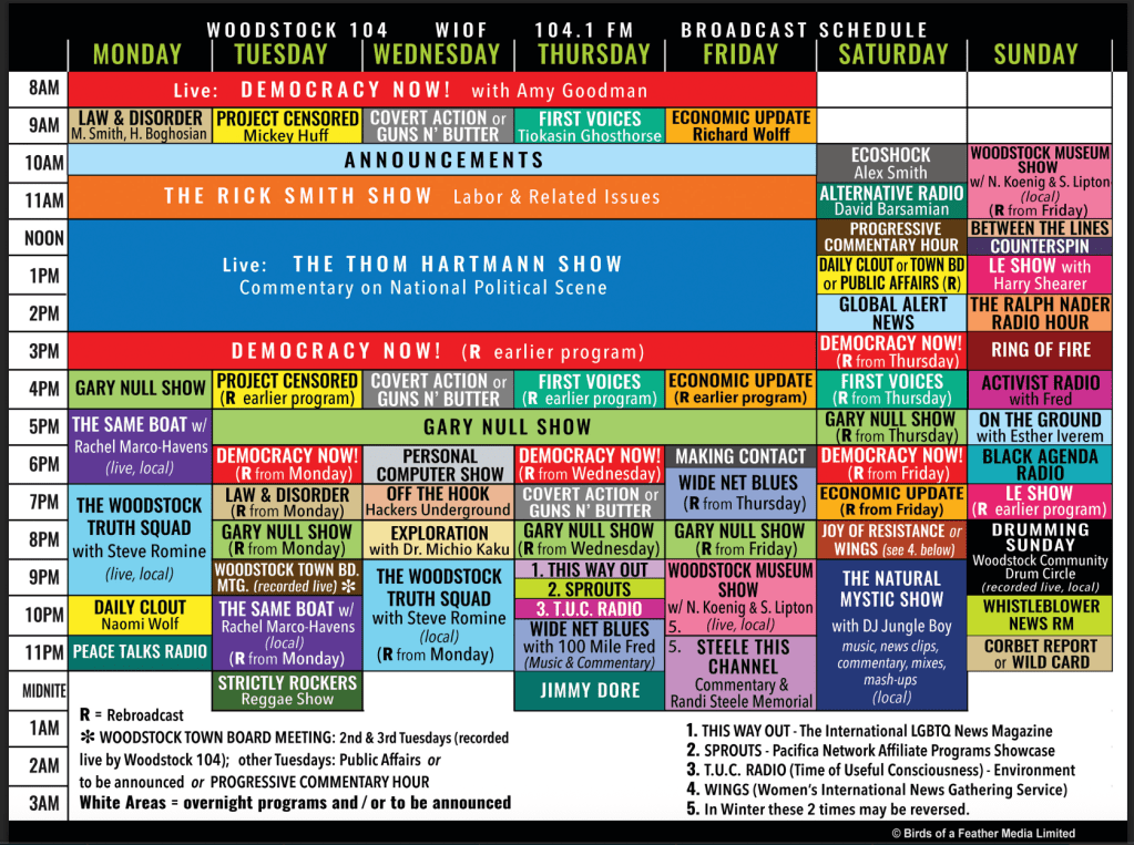WIOF provides Pacifica and Progressive Radio Network programs as well as local programs covering local issues and events—including Woodstock Town Board and the weekly Community Drum Circle on the Village Green.